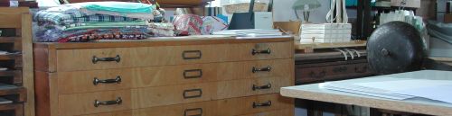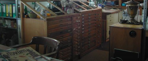 It only just fitted in: the rack full of metal type that came in February found itself a place near the old desk and chair.