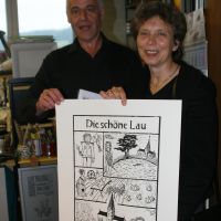 Waechenbeuren’s mayor Karl Vesenmaier is listening to the street ballad - the flowers he brought for the anniversary are as colourful as the pumpkins and the new artist’s books.
