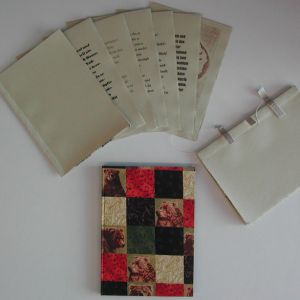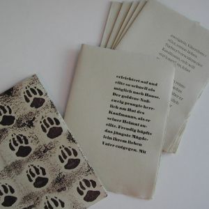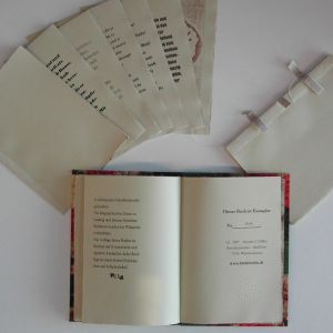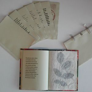 A couple of bookbinding techniques I have studied at Buchbinder-Colleg in Stuttgart, among these were traditional, experimental and Japanese stitching techniques, making of mediaeval inks and paints, making decorated paper. Thus at bleikloetzle’s you can find the classically stitched and bound book, like e. g. “Annette’s and Guenter’s Fine Far Eastern Cooking Book” as seen on the right, and there are books that resemble objects, like the twin concertina book “Human-Dignity-Rights” (shown on the left).