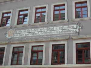 The picture on the right shows a house in Pirna (Saxonia) that originally must have been the home of a bookbinder. The writing says: “What scientist and scholars find, we truly paste and trim and bind”.