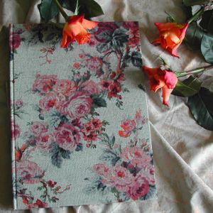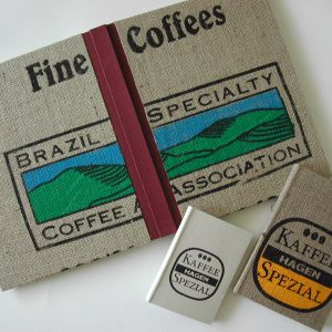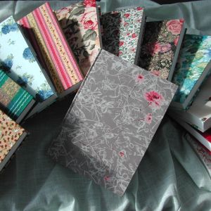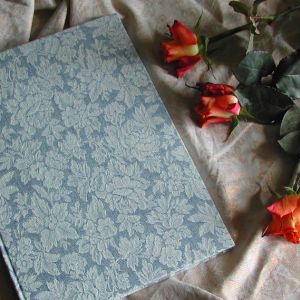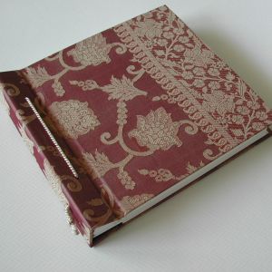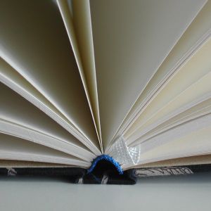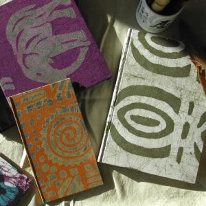 bleikloetzle’s speciality are book covers from cloth, that is, I don’t usually use normal bookbinding cloth for the covers of my books. I choose lovely patterned cloth, be it hand woven, African batik, fine cutwork from India, coarse sackcloth, corduroy, damask, a nicely printed cotton or a gorgeous silk. The picture on the right shows books bound in African batik made by hand (sold by TWIGA-Design at Heidelberg’) – the picture on the left shows a cover made from an outstanding cutwork cloth that has been handmade in the traditional way in India.