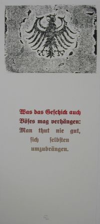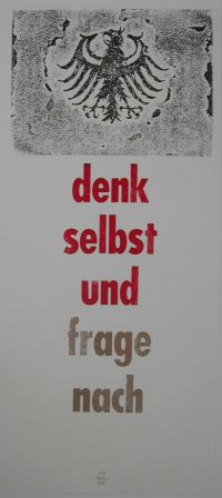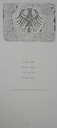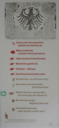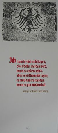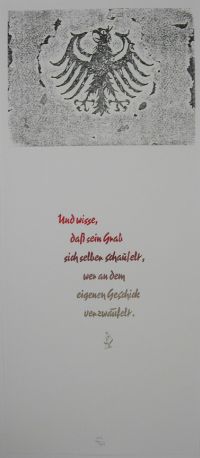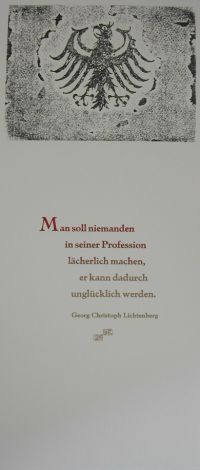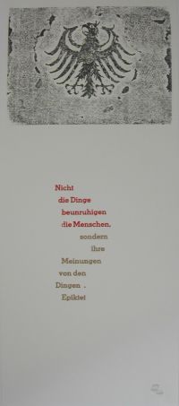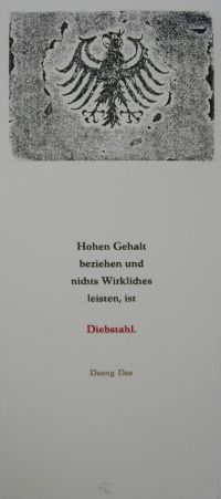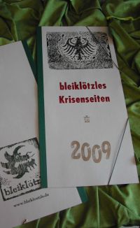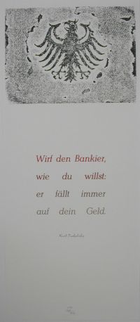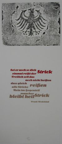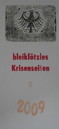 Printed 3-coloured (black-red-golden) on chamois paper, linoprint, different metal type, size of sheets 29x67cm, edition of 13 each. Printed in the year of the crisis 2009.