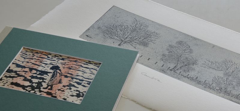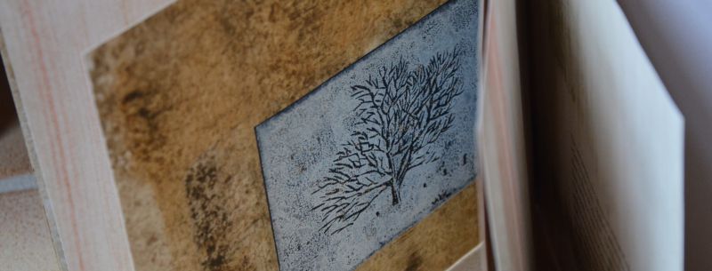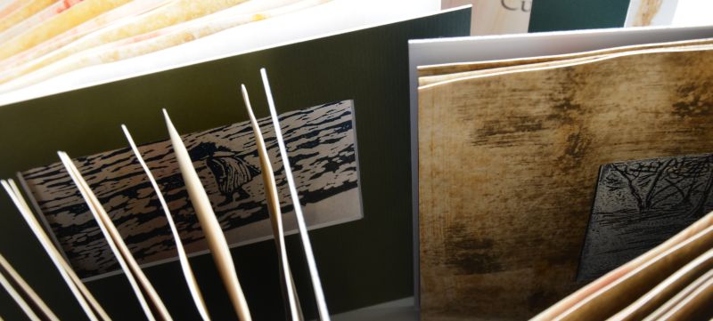 Size approx. 23 x 21 cm, 24 pages, text handset from metal type Trajanus in English with 5 woodcuts rubbed off by hand, paper hand painted prior to printing covers made from colour passpartout board with a window cut in