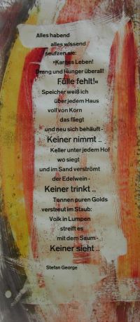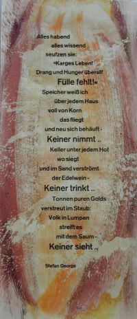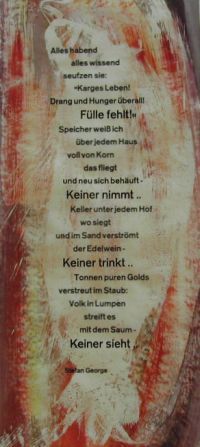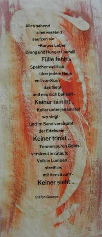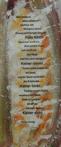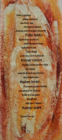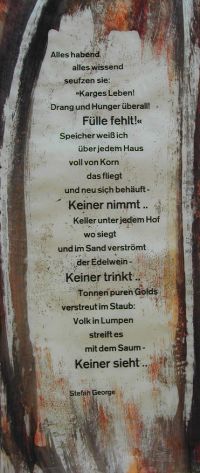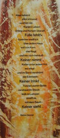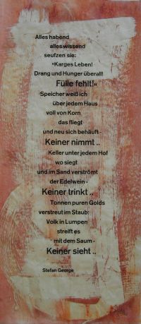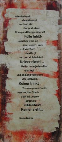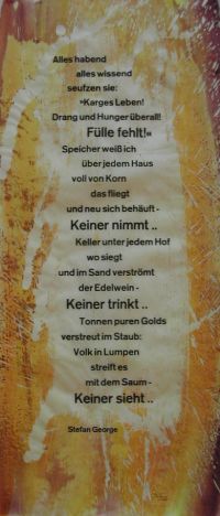 Poem by Stefan George, painted and handprinted on deckle edge paper, set from Akzidenz Grotesk. Size 35x78cm, 9 one-offs.Printed in 2009
