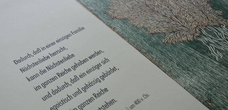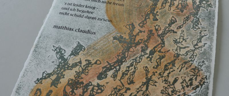 Lines from Matthias Claudius, composed from Semper-Antiqua, linoprint and painting. Deckle edge paper. Size approx. 25x66 cm. 22 sheets (one-of-a-kinds)