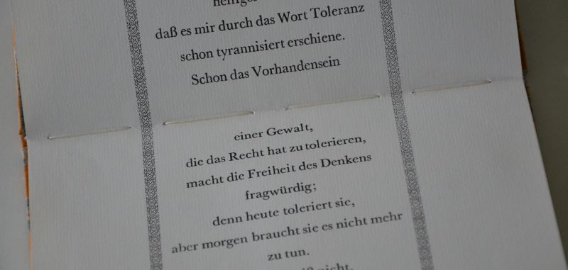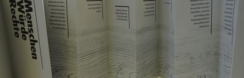 A choice of articles from the Universal Declaration of the Human Rights. Composed by hand from Futura, the veining of a wooden board rubbed off by hand. Book with a twin concertina folding, the covers swing open to make the book stand up. Printed on a strong Fedrigoni paper in a shade of gray and green. 16 pp, 300 by 400 mm (11,8 by 15,7 inch), text in German, English text available via UN-Website.