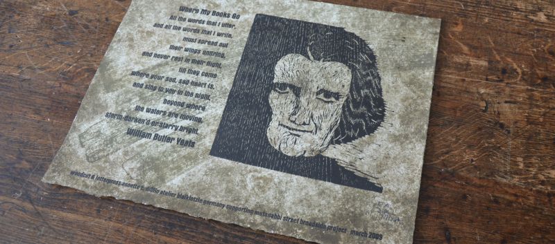 Colour woodcut, text hand composed, letter press printed on white deckle edge paper, Limited edition of 22 copies. Text in German.