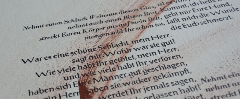 The original text is a folksong by J. Richards and D. Pregg with the titel “The Battle”. Annette C. Disslin put it in German words, composed it by hand from a very worn Post-Antiqua and a couple of different Bodonis. It is printed on a strong chamois deckle edge paper.