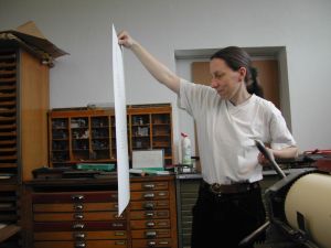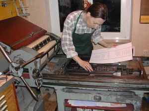 Once you got the proof it can be checked for mistakes. The layout can be changed, wood blocks, that don’t print properly in all parts , can be adjusted. Sheet after sheet is being printed by hand.