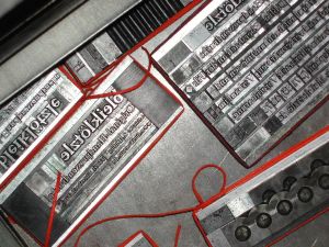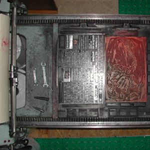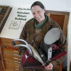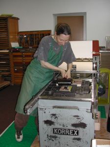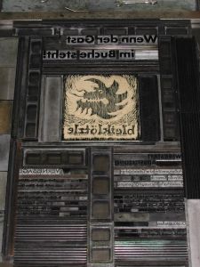 Bleikloetzle’s press is a hand driven cylinder proofing press. The printing cylinder, made from steel, moves over the form after ink has been rolled onto it. Presses like this have not been designed to print a great number of copies. So nowadays they are perfect for the artist, who wants to print one-of-a-kinds or small limited editions. Metal type and wood or lino blocks can be printed at the same time.