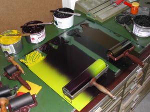 Ink has to be rolled out on an even surface. The rollers transfer the ink onto the plate or the metal type.