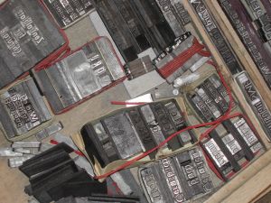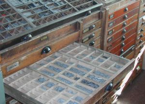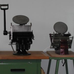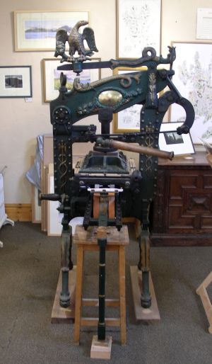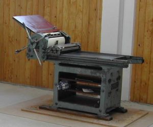 Over the centuries a couple of different types of printing presses developed. These two pictures show platen printing presses - the one on the right being an 8x5 Adana.