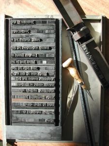 This is rather a time consuming job to do and having only two copies after such a long time is unsatisfactory, young Johannes thinks. He develops the idea of having small stamps that could print a letter each. So you could compose every text you liked, print it, take the text apart and compose another text using the single letter stamps again.