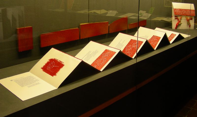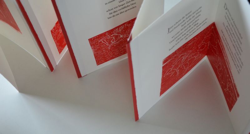 Hand set from Trajanus, 12 pp, 250 by 310 mm (9,8 by 12,2 inch), total length approx. 300 cm, deckle edge paper, hinged with red paper. 6 wood cuts rubbed off the block by hand. Size of portfolia 40 x 40 cm. 11 signed and numbered copies.