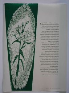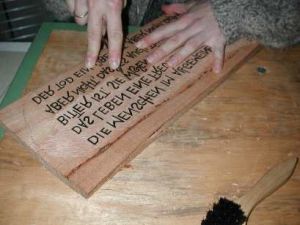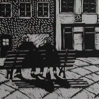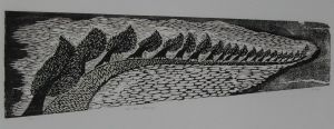 Like letter press woodcut is one of the relief printing techniques. In contrary to intaglio, where ink is rubbed into the engraved parts of the printing plate, in wood and linocut ink lies on the higher parts of the block. All parts that are supposed not to print have to be cut away, thus leaving the block look like a landscape relief, with slopes, summits and valleys – the summits being the parts that print the picture.