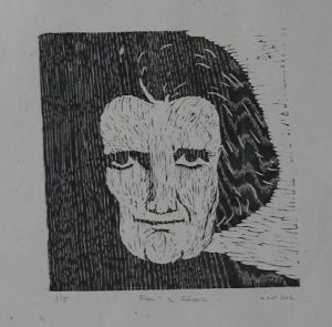 The picture on the left shows a print from a block where on the right end the bark has remained on. Apart from all that it is the veining that gives wood what linoleum never will have. The veining of the block of oak makes the light shine lively on the ladie’s hair (picture on the right). Wood takes its characteristics from its inhomogeneity and this makes wood so dramatically different from the totally homogeneous linoleum which can also be used for relief printing.